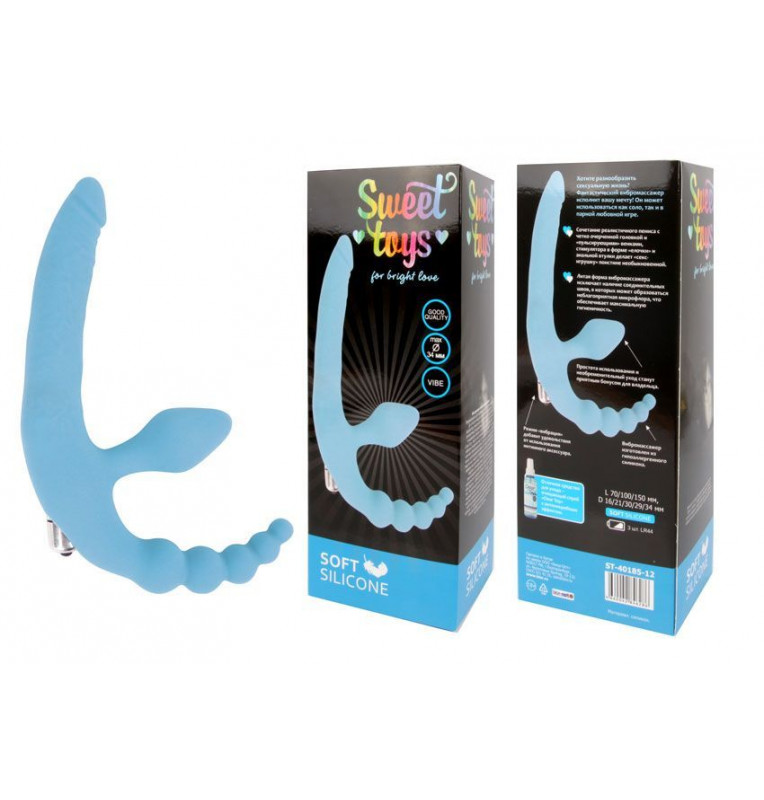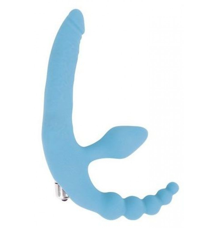 Голубой безремневой страпон с анальным отростком и вибрацией - 15 см.