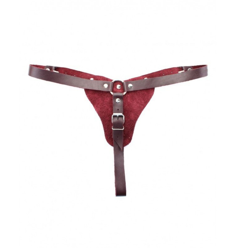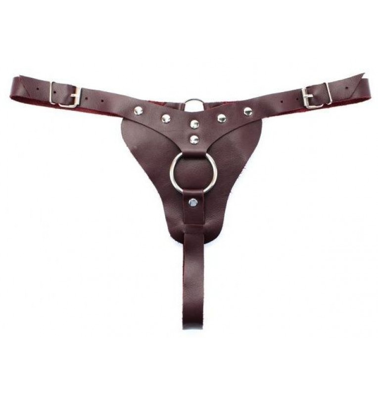 Трусики выполнены из натуральной кожи. Спереди находится металлическое кольцо для страпона. Изделие фиксируется ремнями и пряжками, позволяющими подобрать нужный размер. Сочный и дерзкий аксессуар поможет воплотить задуманное в реальность!