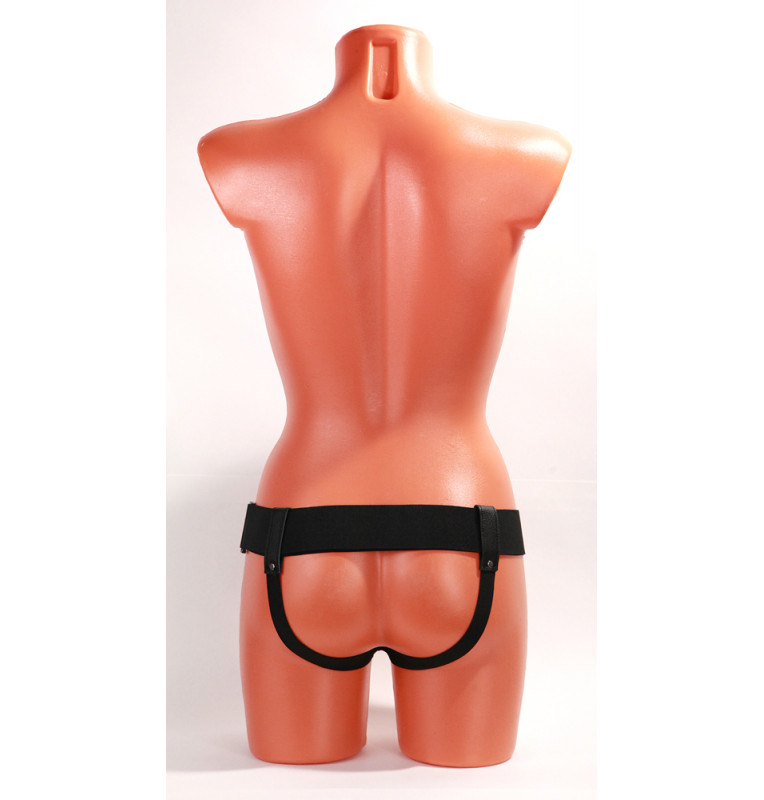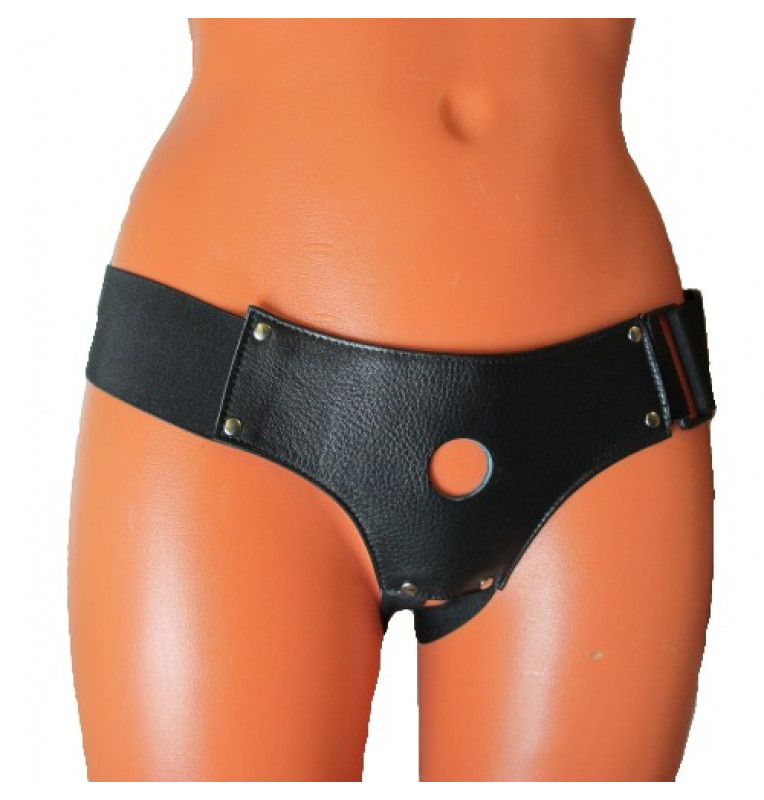 Трусики для страпона, изготовлены из кожи, имеют отверстие-доступ в области бикини. Крепятся при помощи широких эластичных лент. Размер легко меняется при помощи застежки. Диаметр отверстия для страпона - 2,5 см.