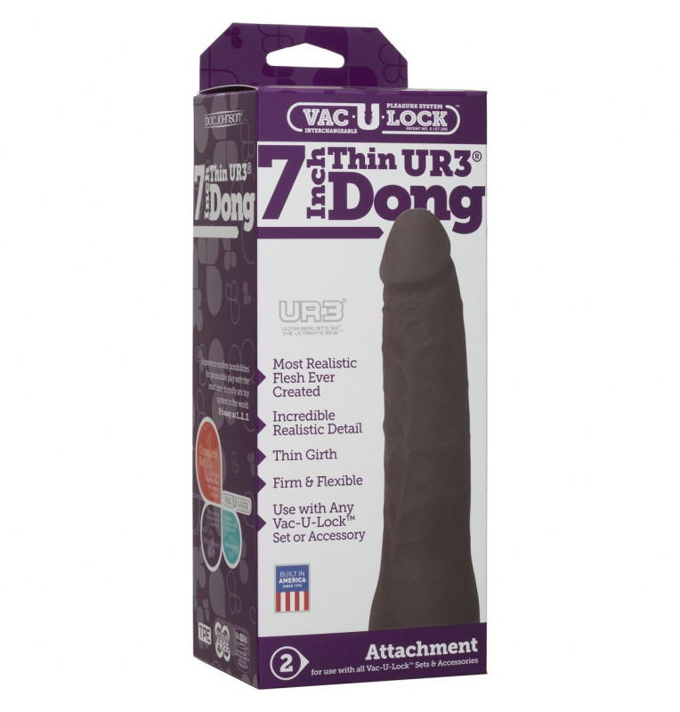 Реалистичная темнокожая насадка Vac-U-Lock 7 ULTRASKYN Thin Dong. Подходит ко всем трусикам Vac-u-lock, может использоваться как фаллоимитатор. Рабочая длина - 16,5 см.