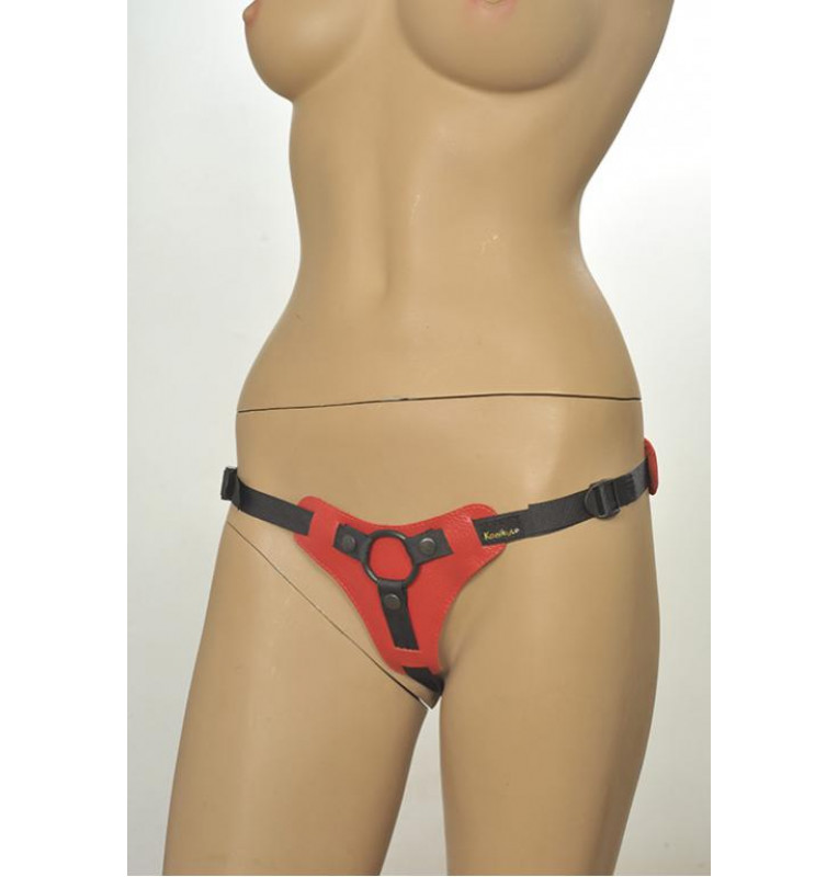 Красно-чёрные трусики для фиксации насадок кольцом Kanikule Leather Strap-on Harness  Anatomic Thong