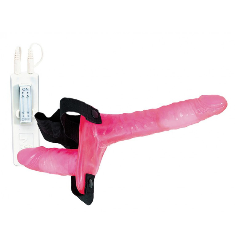 Поясной розовый виброфаллос с вагинальной пробкой. Пояс универсального размера S-M-L-XL. Выносной пульт управления вибрацией. Мультискоростной. Длина вагинальной пробки - 9 см., диаметр - 3,5 см.