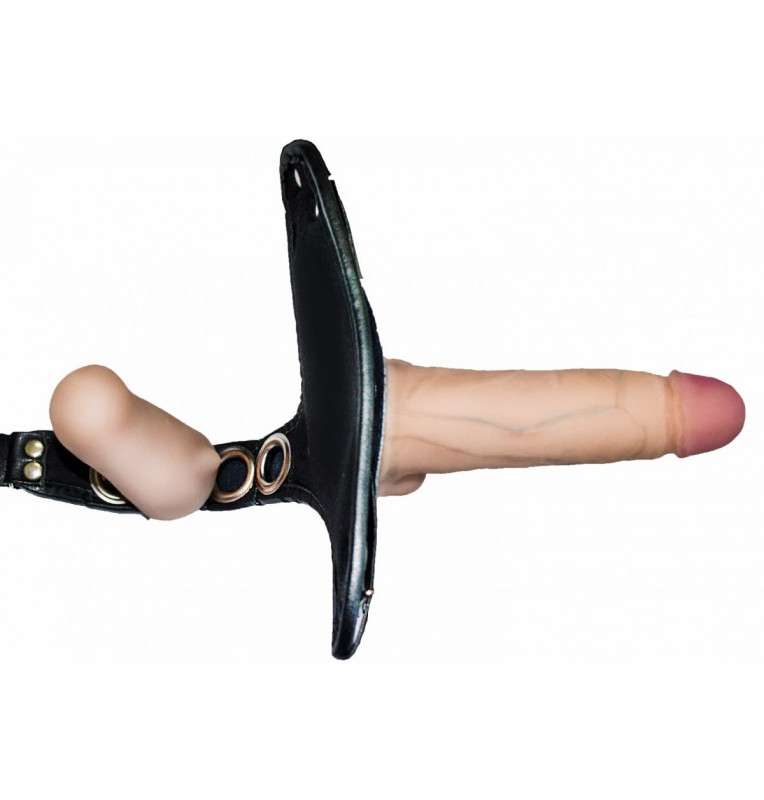 Это вариант - третье, самое «продвинутое» и совершенное поколение поясов для женщин, разработанное с учетом рекомендаций врачей и покупателей. Предполагается использование между женщинами или женщиной и мужчиной. Комплект насадок состоит из трех фаллоимитаторов. Внутренний сделан из атравматичной кибер-кожи на каркасе, передающим стимулирующее воздействие на клитор и вход во влагалище. Четыре отверстия позволяют регулировать эту насадку вне зависимости от комплекции и анатомических особенностей. Внутренний, вагинальный фаллоимитатор можно использовать одновременно с анальной насадкой, которая фиксируется на свободном отверстии. Внешних насадок две. Одна выполнена из мягкого материала неоскин на эластичной полужесткой основе. Атравматичная, нежная поверхность придает особенный комфорт отношениям. Предназначена в основном для вагинального контакта с партнершей. Это распространенный размер, подходящий большинству рожавших женщин. Два отверстия так же позволяют более удобно расположить этот слегка изогнутый фаллоимитатор с характеристиками эрегированного мужского пениса. Модель с изогнутой формой позволяет перевернуть, при необходимости, фаллоимитатор изгибом вверх и изменить область стимуляции. При этом «мошонка» будет ласкать область клитора. Это преимущество данной модели. Для более брутальных отношений или анального секса имеется третья, полужесткая, небольшая насадка черно-серебристого цвета. Сам пояс выполнен в классическом, строгом стиле БДСМ , но для комфортного использования обладает рядом преимуществ. Так, боковые фастексы после точной подгонки и регулировки по фигуре позволяют расстегивать и вновь надевать страпон , не требуя регуляции в дальнейшем. Мягкая бейка по краям и мягкий, вспененный материал между слоями кожи гарантируют атравматичное использование. Бандаж на пояснице плотно и мягко удерживает всю конструкцию при любых нагрузках. Полоса кожи над внутренней вагинальной насадкой, при натяжении регуляторами, плотно прижимает и фиксирует фаллоимитатор в оптимальной позиции, не давая ему чрезмерно выдвигаться вперед. Качественная, синтетическая кожа легко стерилизуется антисептиками и моется бактерицидным мылом. Три коннектора и универсальность стыковочного узла позволяют использовать абсолютное большинство насадок, входящих в ассортимент магазинов и продающихся отдельно. Длина внешней фаллической насадки - 18,5 см., рабочая длина - 16 см., диаметр - 4,5 см. Длина внешней анальной насадки - 14,5 см., диаметр - 3,2 см.