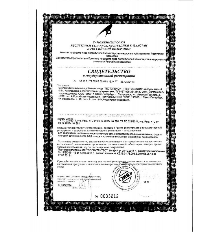 Тестостерон – мужской половой гормон, от которого зависит сексуальная функция (потенция), тип фигуры и здоровье мужчины. Оказывается, тестостерон неустойчив, и на его уровень влияют многие причины – стрессы, алкоголь, курение, экология, возраст. Чем выше уровень тестостерона – тем сильнее либидо, чем ниже – тем меньше в мужчине мужских проявлений. Компоненты натурального комплекса для мужчин «Тестогенон» стимулируют выработку в организме собственного тестостерона, возвращая уровень этого гормона в границы здоровой нормы, что помогает восстановить и повысить потенцию, улучшить репродуктивное здоровье. Действие экстрактов растений усилено витаминами и аргинином. «Тестогенон» возможно использовать для восстановления половой функции у мужчин после перенесенных инфекционных и воспалительных заболеваний, для профилактики негативного действия на репродуктивную функцию вредных факторов окружающей среды, включая вибрацию, ионизирующее излучение, токсическое действие алкоголя. Противопоказания: индивидуальная непереносимость компонентов, повышенная нервная возбудимость, бессонница, артериальная гипо-/гипертензия, нарушение ритма сердечной деятельности, атеросклероз, выраженные нарушения функции печени и почек. Перед применением рекомендуется проконсультироваться с врачом.