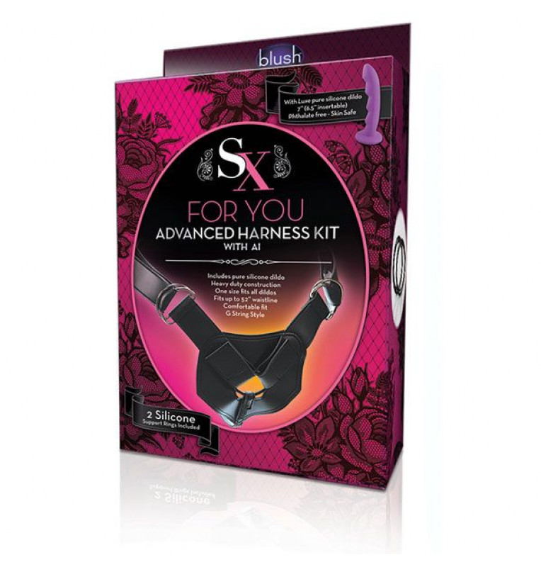 Фиолетовый страпон на регулируемом поясе с кольцами ADVANCED HARNESS KIT WITH AI. Насадка волнообразной формы, выполнена из силикона. Фиксируется на трусиках при помощи кольца (2 в комплекте). Трусики регулируются до 132 см в талии.
