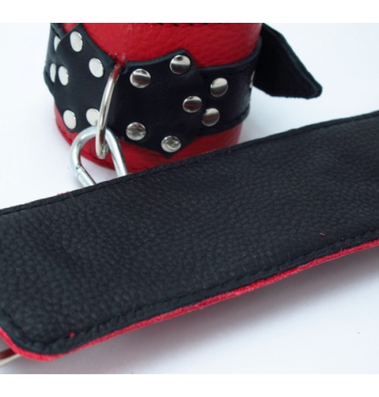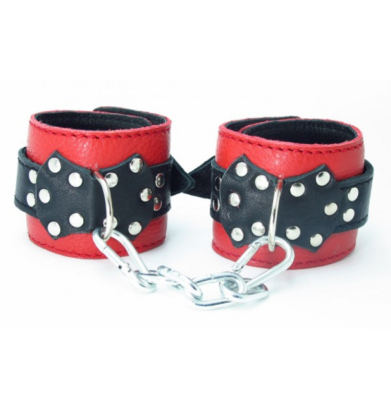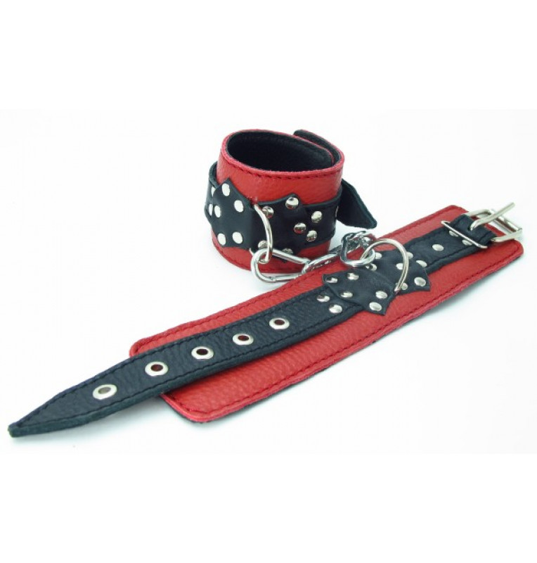 Красные наручники с чёрными проклёпанными ремешками с пряжкой. Ширина - 5 см.
