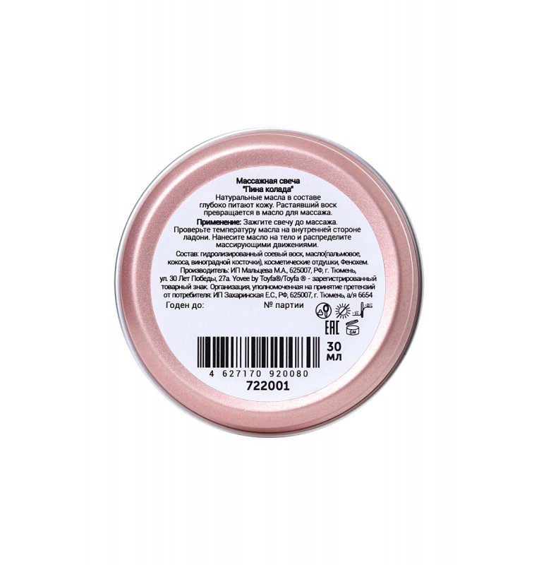 Натуральные масла в составе глубоко питают и увлажняют кожу. Растаявший воск превращается в масло для массажа. Свеча станет идеальным аксессуаром для романтического свидания. Идея для свидания: приготовьте пару коктейлей Пина колада и зажгите массажную свечу. Предложите партнеру расслабиться в ожидании массажа. Погасите свечу и немного подождите, пока масло остынет. Лейте масло вдоль спины медленно, а затем начните с лёгких массирующих движений. Сделайте массаж своим обнаженным телом — так он станет ещё более интимным и чувственным. Такое свидание останется в памяти надолго! Свеча подарит незабываемые ощущения, после которых вам гарантированы нежные и мягкие прикосновения!