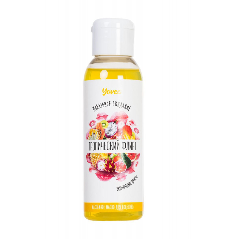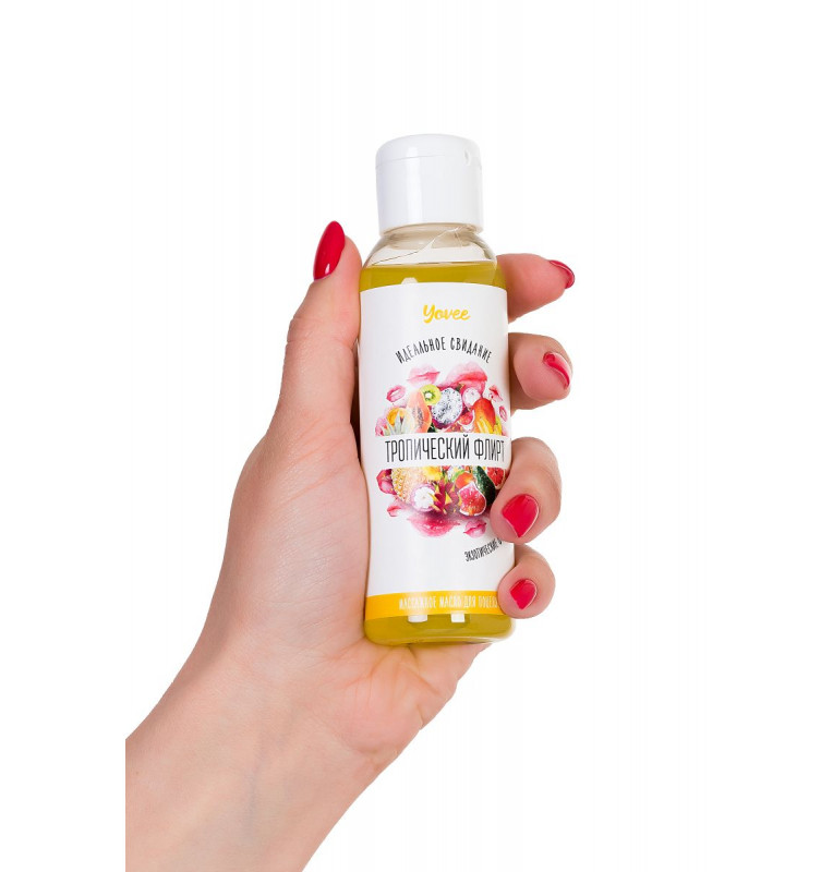 Массажное масло для поцелуев Тропический флирт. Сделайте ваше свидание незабываемым: слизывайте масло прямо со своего партнера! Вам гарантирован настрой на самый экзотический массаж с фруктовым вкусом. Идея для свидания: Предложите партнеру экзотический массаж с поцелуями. Лейте масло вдоль спины медленно, а затем начните слизывать приятное на вкус масло прямо с тела партнера. Такое свидание останется в памяти надолго!