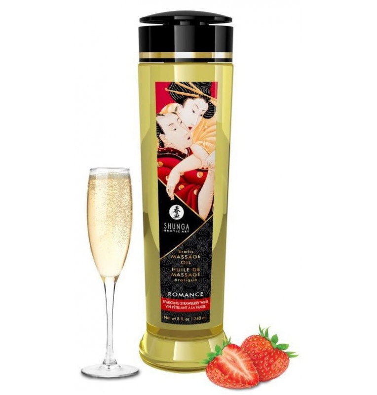 Массажное масло с ароматом клубники и шампанского Romance. 100% натуральные масла холодного отжима, с витамином Е (антиоксидант), без жирных остатков, не забивает поры, нет минерального или животного масла. Мягкость и шелковистость этого масла с приятным скользящим эффектом на коже вызывает ощущение полного восторга. Сексуальное желание нарастает и вы готовы к любви. Получите взаимное удовольствие от чувственного эротического массажа с использованием нашей эксклюзивной смеси масел холодного отжима, тщательно отобранных за свои стимулирующие и придающие энергию свойства. Масло легко скользит по коже, не оставляя жирных ощущений, в то время как различные экзотические ароматы поднимут ваши чувства до вершин возбуждения. Идеально подходит для того, чтобы насладиться расслабляющим массажем или сделать его, совместив с обволакивающими обольстительными ласками. Это на 100 % натуральное масло с упоительным ароматом, легко скользит по коже, не оставляя жирной пленки. Запах массажному маслу придают эфирные масла и отдушки, что в отличие от большей части другой продукции SHUNGA, ароматизированной вкусовыми добавками, делает его несъедобным.