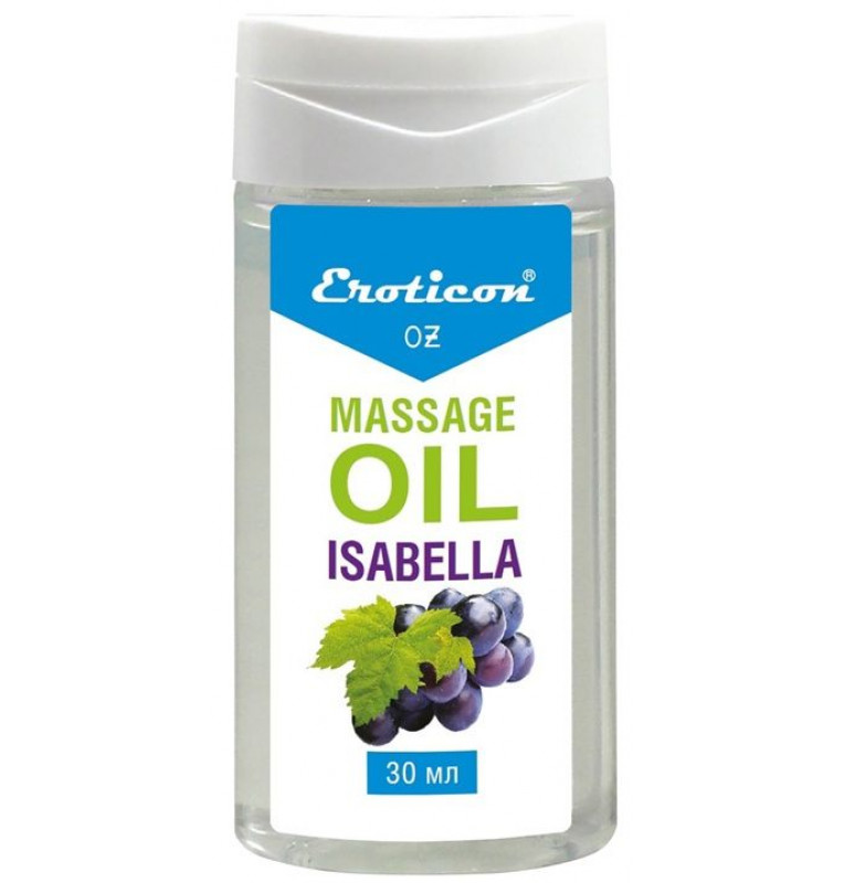 Массажное масло Isabella с ароматом винограда «Изабелла». Массажное масло на натуральной основе с эфирными маслами. Оно имеет аромат широко известного винограда Изабелла и поможет вам органично и плавно перейти к главному в нашей жизни — сексу! Обеспечивает легкое скольжение, не повреждая кожный покров, не допуская появления синяков. Масляные смеси оказывают смягчающее и увлажняющее действие, делают кожу эластичной и ускоряют ее регенерацию. Эфирные компоненты способствуют как физическому, так и психологическому расслаблению.