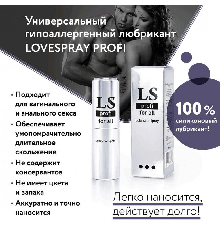 Осмельтесь на самые откровенные желания с Lovespray profi! Благодаря специальной формуле силиконовый лубрикант в форме спрея обеспечивает умопомрачительно долгое скольжение. Быстро и легко наносится на интимные зоны. Идеально подходит и мужчинам, и женщинам для любых видов интимной близости. С Lovespray profi легко взять курс на оргазм и быстро достигнуть нужных «берегов». Особый состав спрея позволяет забыть об ощущении липкости и жирности. Огромный плюс спрея-лубриканта, что он гипоаллергенный, не содержит консервантов, без цвета и запаха.