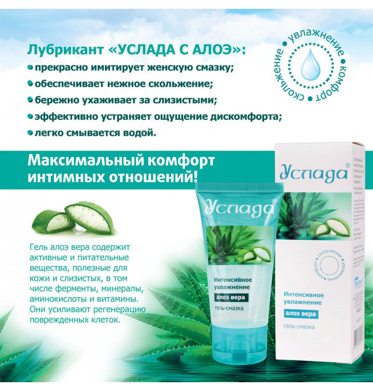 Гель-лубрикант «Услада с алое вера» создан специально для интенсивного ухода за склонными к сухости слизистыми половых органов. Алое вера - уникальное растение, содержащее огромное количество полезных веществ, обладающих целебными свойствами. На протяжении многих веков оно успешно применяется для профилактики и лечения различных заболеваний. Входящий в состав смазки сок алое содержит биоактивный комплекс, способствующий глубокому увлажнению, сохранению упругости и эластичности тканей интимных зон. Гель образует защитный, великолепно скользящий слой. При регулярном использовании смазка восстанавливает необходимый водный баланс. Лубрикант «Услада с алое вера»: - бережно ухаживает за слизистыми - активно питает и увлажняет ткани интимных зон - эффективно устраняет ощущение дискомфорта - способствует нормализации водного обмена - прекрасно имитирует женскую смазку - легко смывается водой. Услада с алое вера - маскимальный комфорт интимных отношений!