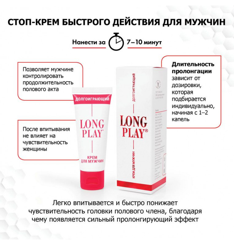 Мужской крем длительного действия для продления полового акта. Легкий, моментально впитывающийся крем, начинающий свое тормозящее действие уже спустя 7-10 минут с момента нанесения. Этот крем применяют мужчины, которые хотят быть сильными в любви и продлить время полового акта. Крем длительного действия дает мужчине возможность затянуть свое семяизвержение до появления женского любовного упоения. Применение крема совместимо с изделиями из резины и латекса (презерватив, искусственная вагина), а также смазками.