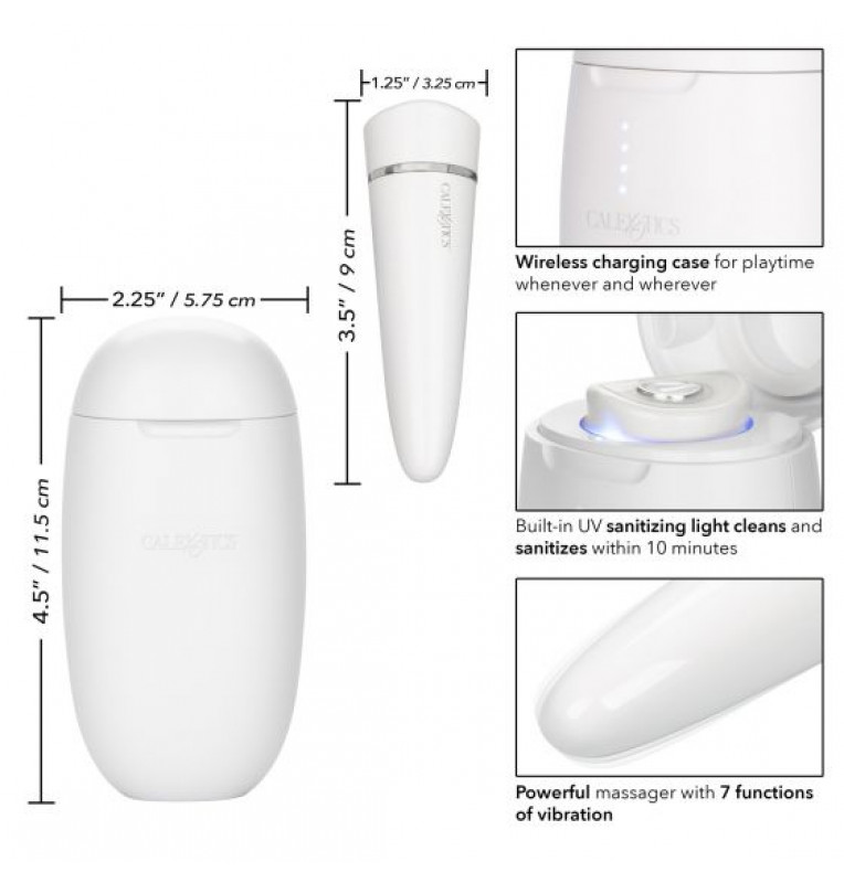 Благодаря уникальному зарядному футляру, встроенному УФ-дезинфицирующему свету и мощным вибрациям, вибропуля My Pod - это будущее всех игрушек данной индустрии! Этот массажер - первый в своем роде с футляром для беспроводной зарядки с магнитным соединением и индикатором заряда батареи. Встроенный УФ-дезинфицирующий свет очищает и дезинфицирует пулю в зарядном футляре за 10 минут. Вибропуля выполнена из высококачественного АБС-пластика и безникелевого сплава, имеет 12 режимов вибрации, пульсации и эскалации. Время зарядки - 2 часа. Время работы - до 50 мин. Размер чехла - 11,5 х 5,75 х 4,5 см.
