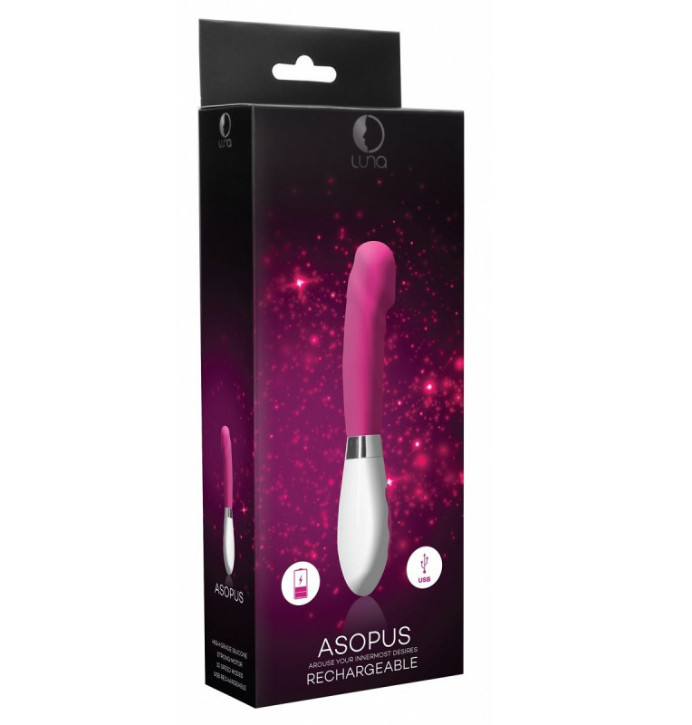 Asopus – вибромассажер для точки G. Эта игрушка имеет особую эргономичную форму с ярко-выраженной фаллической головкой, что делает стимуляцию более целенаправленной. Вибромассажер имеет 10 функций вибрации, способной достигать 5200 оборотов в минуту, при этом уровень звука не превышает 50 дБ. Вибромассажер заряжается через USB и может быть подключен практически в любом месте. Просто подсоедините идущий в комплекте шнур к совместимому порту компьютера или USB-адаптера (приобретается отдельно), а противоположный конец со штекером к игрушке. Полная зарядка занимает 30 минут, ее достаточно для беспрерывной работы до 60 минут. Рабочая длина - 11,5 см.