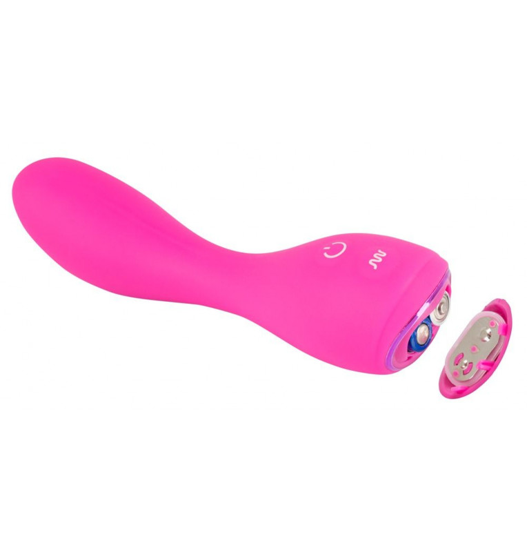 Розовый вибратор с плотным, загнутым наконечником для стимуляции точки G. Работает в 10 режимах. Кнопки (включение/выключение и вибрация) мигают в такт вибрации. Минимальный диаметр - 2,1 см.