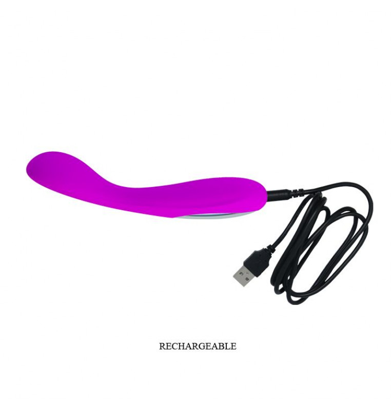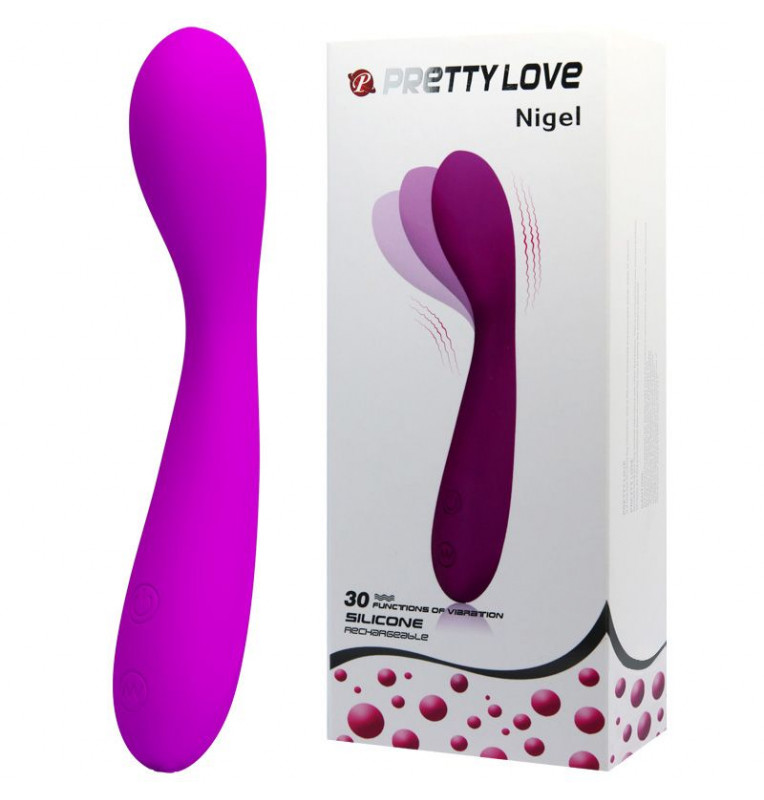 Лиловый силиконовый перезаряжаемый вибромассажёр Nigel. Изогнутая форма идеальна для массажа точки G. 30 функций вибрации.
