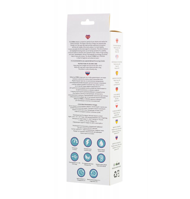 Вибратор SYRIN создан для того чтобы удовлетворить все ваши желания и воплотить в жизнь самые смелые фантазии. Форма игрушки простая, но анатомически продуманная, волнообразный рельеф оказывает дополнительную стимуляцию, а мягкая середина девайса позволяет ему слегка гнутся, так что вы без труда найдете идеальный угол для стимуляции. Для удобства использования кнопки устройства подсвечиваются во время включения и в процессе работы. К вашим услугам десять режимов вибрации и мощный мотор. Изготовлен из легкого в эксплуатации, нетоксичного, гипоаллергенного силикона. Перезаряжаемая технология при помощи USB (в комплекте) избавит вас от постоянной покупки батареек. Вибратор SYRIN от L’EROINA идеально подходит для начинающих и опытных пользователей! Минимальный диаметр - 2,8 см.