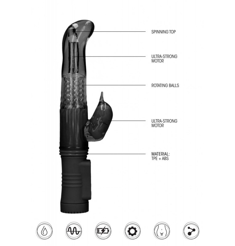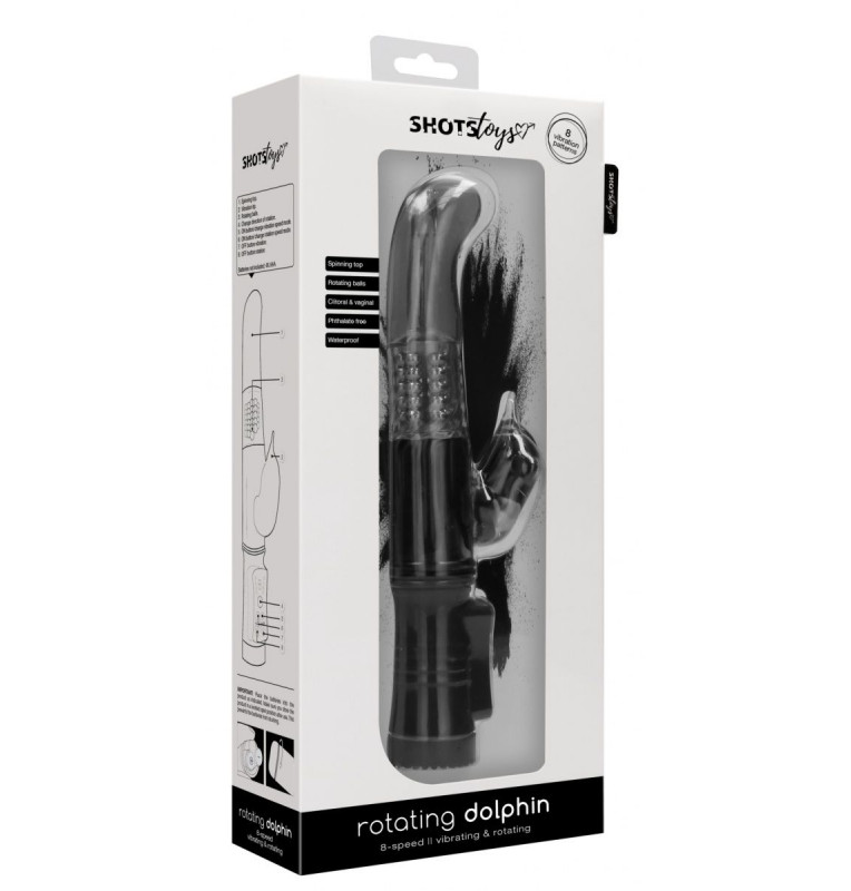 Rotating Dolphin – вибромасссажер-кролик с функцией ротации. Два сверхмощных моторчика обеспечивают 8 уникальных функций вибрации, способных достигнуть скорости больше 15.500 оборотов в минуту, но при этом не очень громкие на уровне 50 дБ. Вагинальный отросток у этой модели имеет вращающиеся бусины и загнутый кончик для целенаправленной стимуляции. Клиторальный отросток имеет конусообразный носик и управляется отдельно. Рабочая длина - 11,5 см.