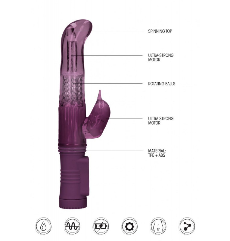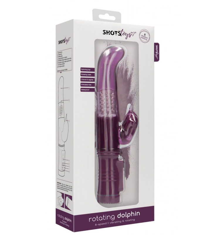 Rotating Dolphin – вибромасссажер-кролик с функцией ротации. Два сверхмощных моторчика обеспечивают 8 уникальных функций вибрации, способных достигнуть скорости больше 15.500 оборотов в минуту, но при этом не очень громкие на уровне 50 дБ. Вагинальный отросток у этой модели имеет вращающиеся бусины и загнутый кончик для целенаправленной стимуляции. Клиторальный отросток имеет конусообразный носик и управляется отдельно. Рабочая длина - 11,5 см.