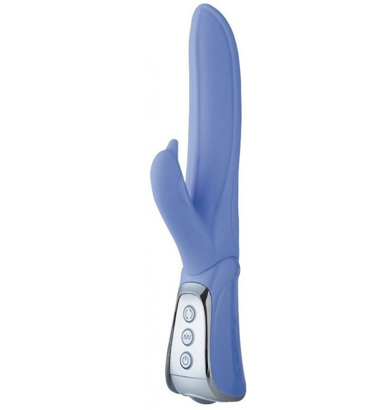 Вибромассажер EXHILARATION из 100 % медицинского силикона голубого цвета с клиторальным стимулятором в виде дельфина, имеющий три режима вибрации и четыре режима пульсации, также три скорости вращения ствола. Все функции регулируются удобными сенсорными кнопками. Кнопки имеют голубую подсветку. Необычно стильный и эргономичный дизайн. Водонепроницаемый, тихий, но с мощной вибрацией. Без постороннего запаха, не пористый, без швов. Рабочая длина - 15,5 см.