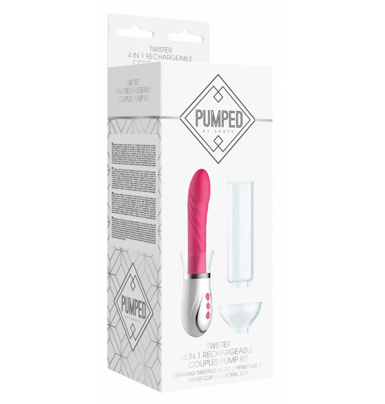 Twister - 4 in 1 Rechargeable Couples Pump Kit - набор, состоящий из 4 предметов. В него входят универсальное основание, к которому могут быть прикреплены помпа для сосков или клитора, помпа для груди или вульвы, помпа для пениса и насадка в виде дилдо с функцией ротация. Мощный мотор, способный вращаются со скоростью 11000 об/мин, обеспечивает 4 уровня всасывания и 7 режимов вибрации. Комбинации, которые можно получить с помощью этого набора, бесконечны. Помпы способствуют стимуляции и увеличению чувствительности сосков, клитора, груди, вульвы. Помпа для пениса обеспечивает более твердую эрекцию, а также при регулярном использовании увеличение полового органа. Насадка в виде дилдо может быть использована как самостоятельно, так и в сочетании с вагинальной помпой, обеспечивающей одновременную стимуляцию влагалища и сосание клитора и вульвы. Насадка в виде дилдо позволяет обеспечить одновременную стимуляцию влагалища и всасывание клитора. Основа заряжается через специальный аккумуляторный USB кабель, который может быть подключен практически в любом месте. Просто подсоедините идущий в комплекте шнур к изделию и совместимому порту компьютера или USB-адаптера (приобретается отдельно). Полная зарядка занимает 120 минут, ее достаточно для беспрерывной работы в течение 120 минут. Длина основы - 9,3 см. Длина колбы для члена - 24 см., диаметр - 6,9 см. Длина колбы для клитора - 4,5 см. Длина колбы для груди - 5,7 см. Длина насадки - 15,5 см., диаметр - 3,5 см.