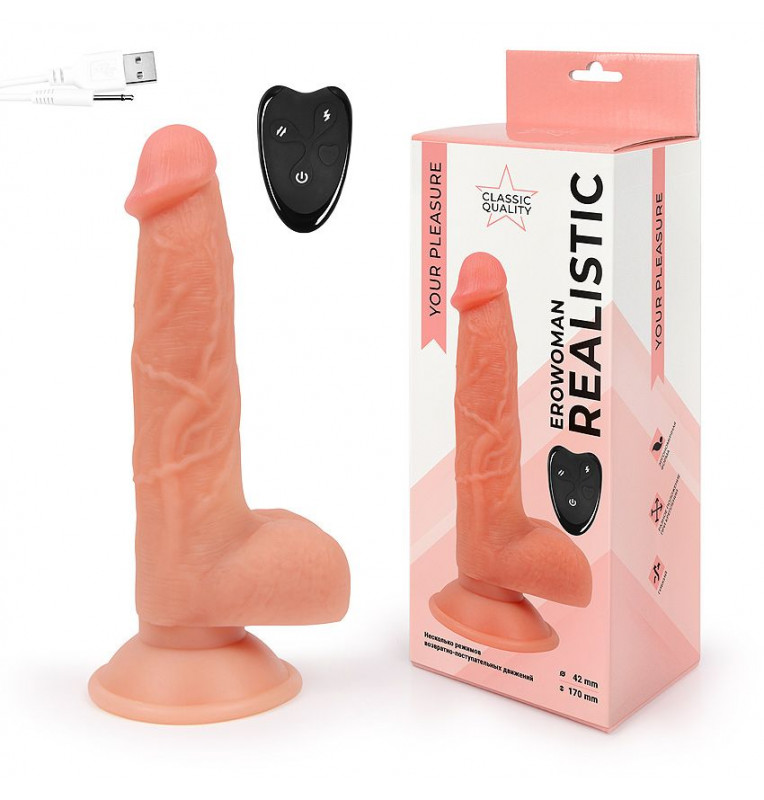 Реалистичный вибромассажёр c разнообразными режимами возвратно-поступательных движений. Присоска позволит прочно закреплять изделие на ровной поверхности в горизонтальном или вертикальном положении. В комплект входит USB провод для зарядки секс-игрушки, дистанционный пульт, батарейка для пульта. Для включения/выключения вибромассажёра необходимо нажать и две секунды удерживать кнопку на его корпусе. Переключение возвратно-поступательных режимов осуществляется с помощью краткого нажатия на ту же кнопку. Для управления работой эротического аксессуара с помощью пульта, необходимо сначала нажать кнопку включения/выключения на его корпусе, а затем использовать кнопки на самом пульте. Выключить секс-игрушку также можно с помощью соответствующей кнопки на пульте. Рабочая длина - 17 см.