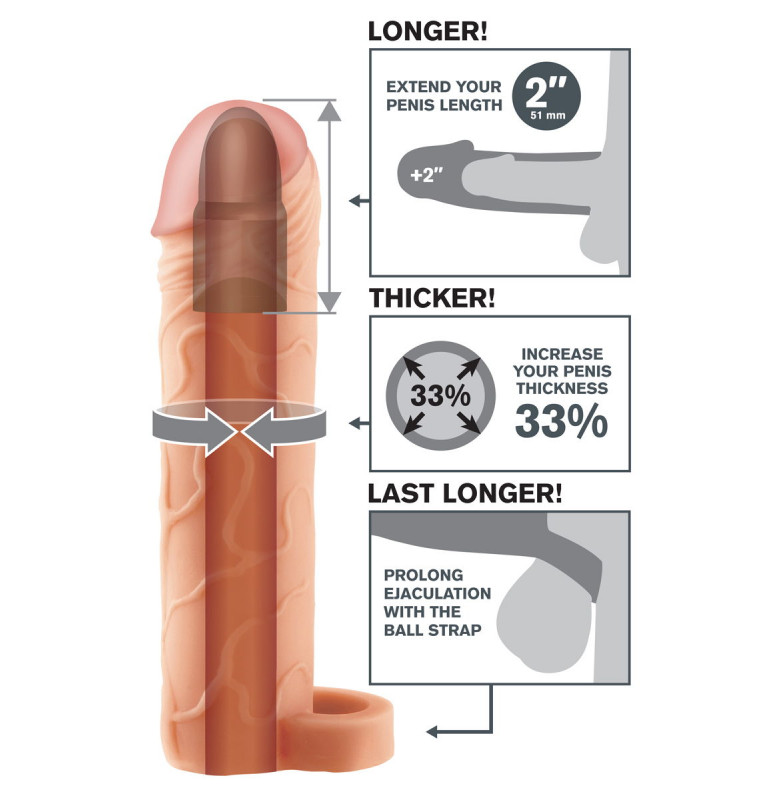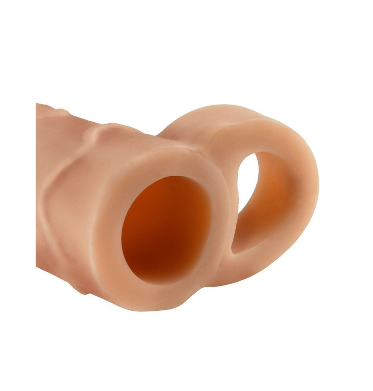 Реалистичная насадка с выделяющимися венами, складками, ярко выраженной головкой. Изготовлена из супер-эластичного Fanta Flesh материала. Материал не содержит фталатов. Подходит для большинства размеров. Увеличивает диаметр (даёт в среднем 33% увеличения в диаметре от исходных параметров) и увеличивает длину на 5,1 см. У основания насадки имеется кольцо, которым опоясывается мошонка для пролонгации полового акта. Также кольцо способствует удержанию насадки на месте. Внутренний диаметр - 2,7 см. Прирост длины - 5,1 см.