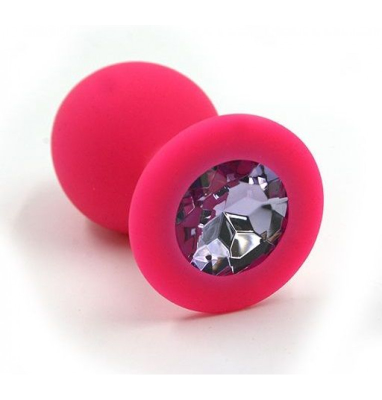 Анальная пробка из силикона розового цвета, размер M. Страз в основании круглой формы, выполнен из стекла светло-фиолетового цвета. Упакована в вельветовый мешочек для хранения. Вес - 46,5 граммов.