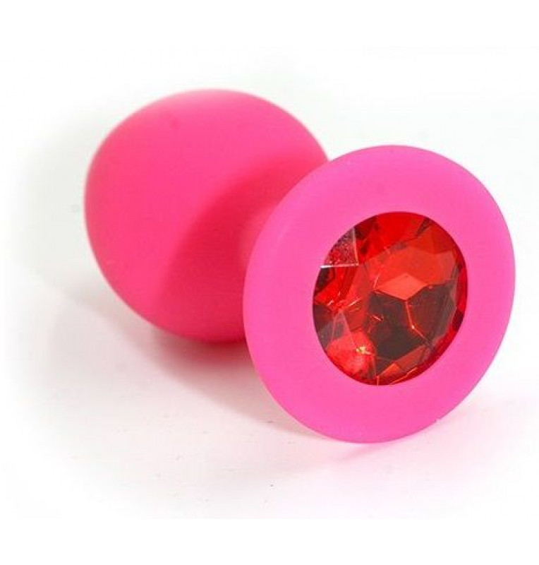 Розовая силиконовая анальная пробка с красным кристаллом - 7 см.