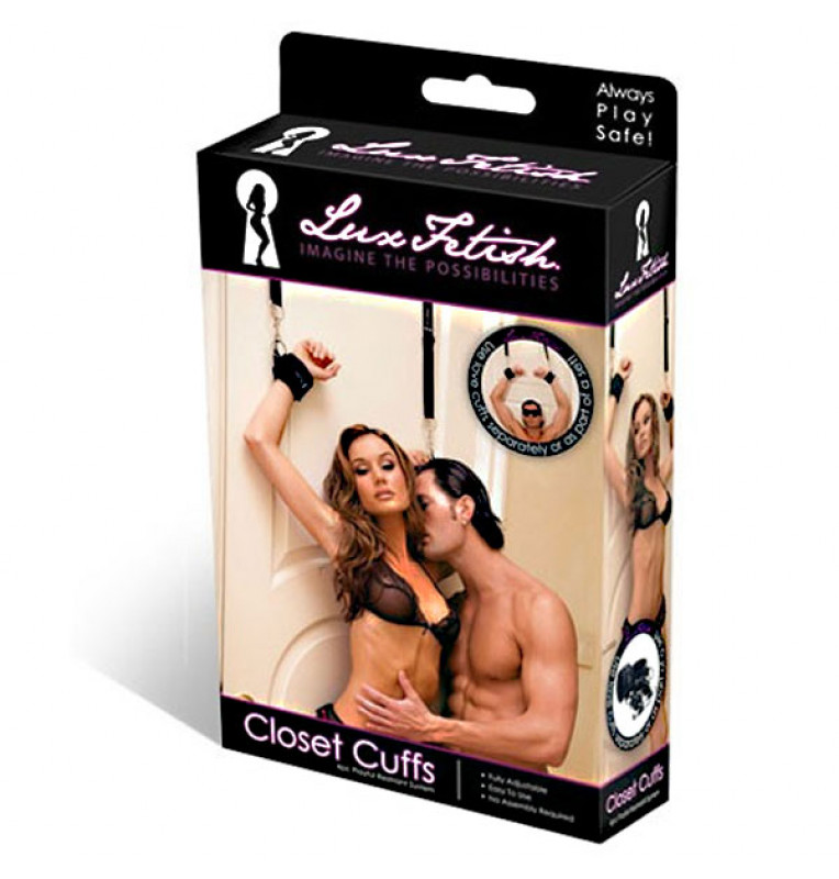 Черные наручники из мягкого поролона, размер регулируется на липучках. Манжеты можно использовать отдельно или вместе со стропами, которые можно закрепить на двери. Прозрачные цилиндрики перебрасываются через дверь, она закрывается и Ваш пленник вынужден держать руки вертикально.