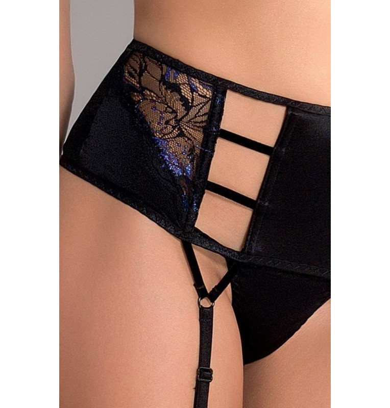 Meredith - комплект, который состоит из трёх идеально дополняющих друг друга элементов – бюстгальтера, пояса и стрингов. Комплект выполнен из чёрного эластичного сатина, дополненного кружевом и чёрным тюлем. Остроты придаёт декольте типа open bra. Дополнением являются чёрные ремешки, что придаёт всему комплекту небанальный характер. В комплекте: бюстгальтер, пояс, трусики-стринги.