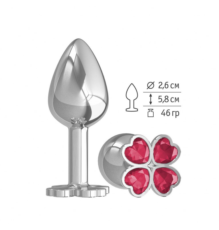 Серебристая анальная втулка с клевером из малиновых кристаллов - 7 см.