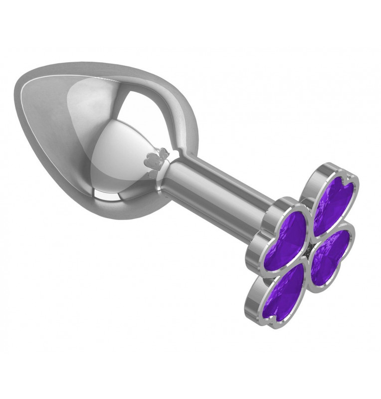 Серебристая анальная втулка с клевером из фиолетовых кристаллов - 7 см.