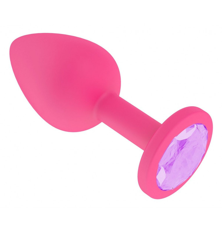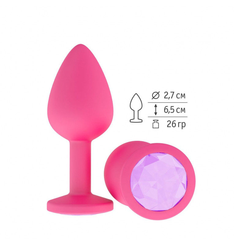 Розовая конусовидная силиконовая анальная пробка с сиреневым кристаллом - 7,3 см.