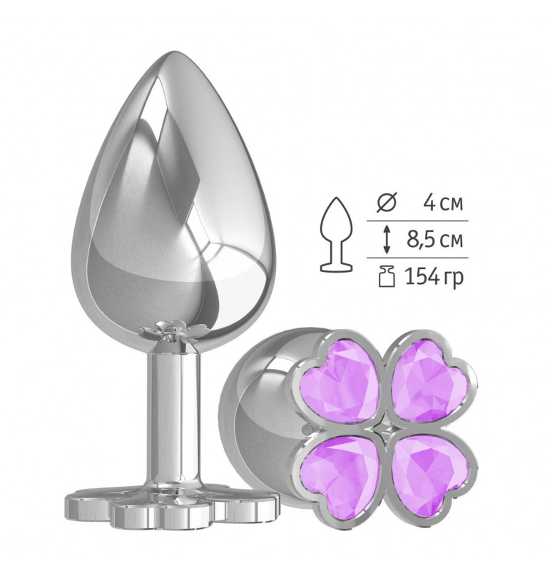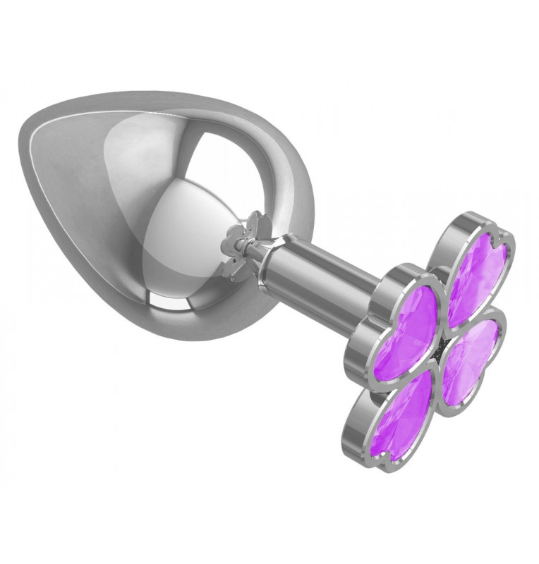 Серебристая анальная пробка-клевер с сиреневым кристаллом - 9,5 см.