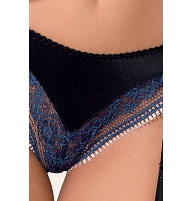 Комплект белья Gisele черного цвета, декорирован мягкой сеточкой синего цвета. Чулки в комплект не входят. В комплекте: бюстгальтер, трусики-пояс.