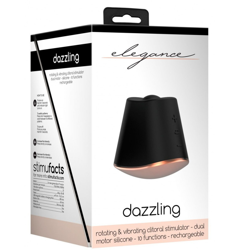 Эта элегантная и грушка имеет 2 сверхмощных моторчика нового поколения, которые вибрируют с потрясающей скоростью. 10 режимов вибрации. У DAZZLING есть уникальная функция поворота на 180/360 градусов по часовой и против часовой стрелки для полной стимуляции под любым углом, которая обеспечивает сногсшибательный смешанный оргазм. DAZZLING сделан из шелковистого гладкого медицинского силикона, водонепроницаем .
