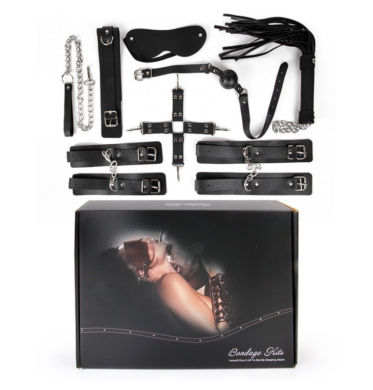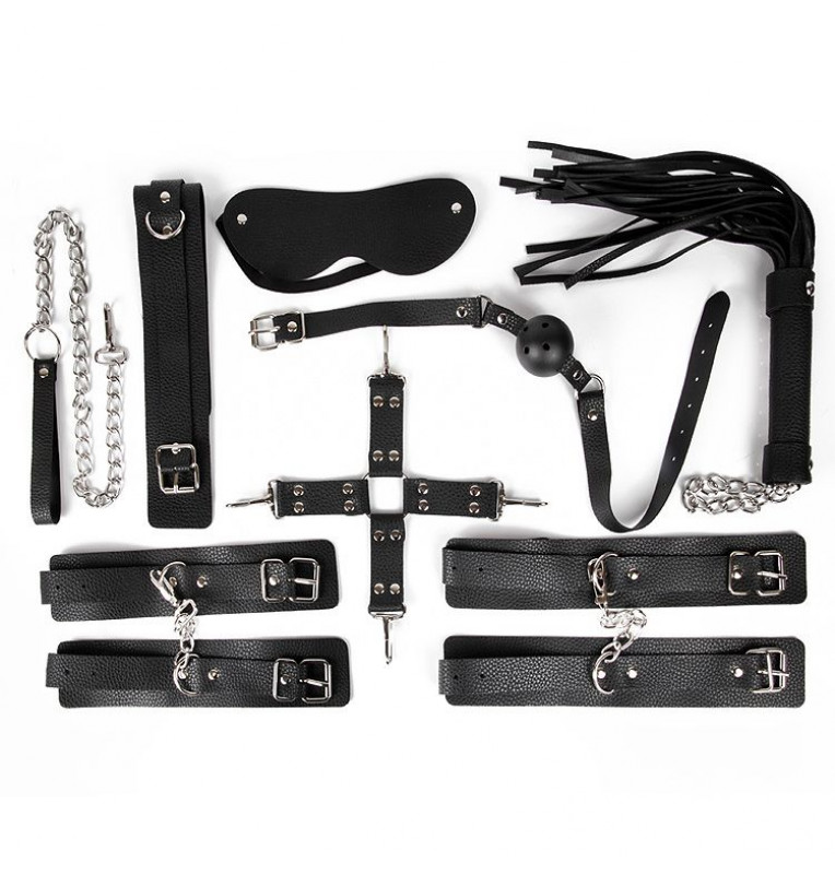 Великолепный набор аксессуаров для любителей БДСМ. В комплект входят наручники, оковы, ошейник с цепочкой-поводком, фиксатор, плеть, кляп, маска. Кляп, наручники, оковы, ошейник и маска снабжены специальной внутренней накладкой, предотвращающей натирание кожи. Также изделия имеют возможность регулирования размера. Плеть-флоггер состоит из хвостов и удобной рукоятки с металлическими вставками и петлёй для подвешивания на крючок. Кляп оснащён шариком с отверстиями для дыхания. Наборы упакованы в большие коробки. Длина хвоста флоггера - 24 см., рукояти - 15 см.