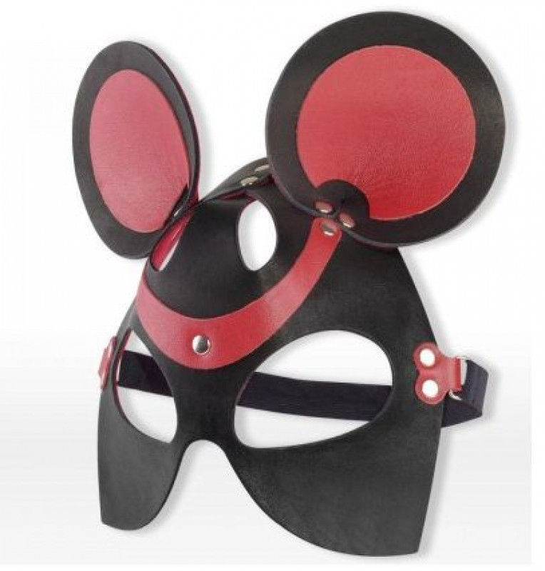 Маска мышки из красной и черной натуральной ременной кожи с миндалевидными прорезями для глаз, украшенная металлическими заклёпками серебристого цвета. Для максимального комфорта маска имеет бархатистую велюровую подкладку, обеспечивающую приятные тактильные ощущения при соприкосновении с кожей лица. Фиксирующая резинка с пряжкой позволяет легко регулировать размер изделия.