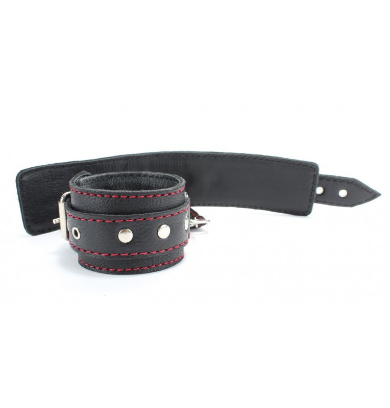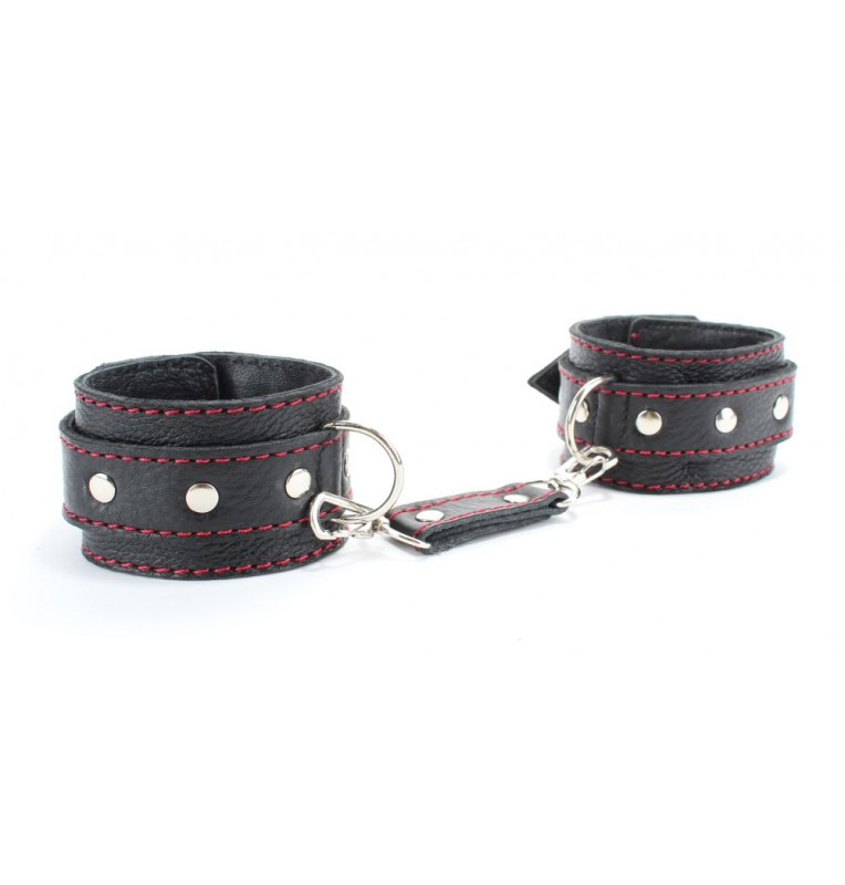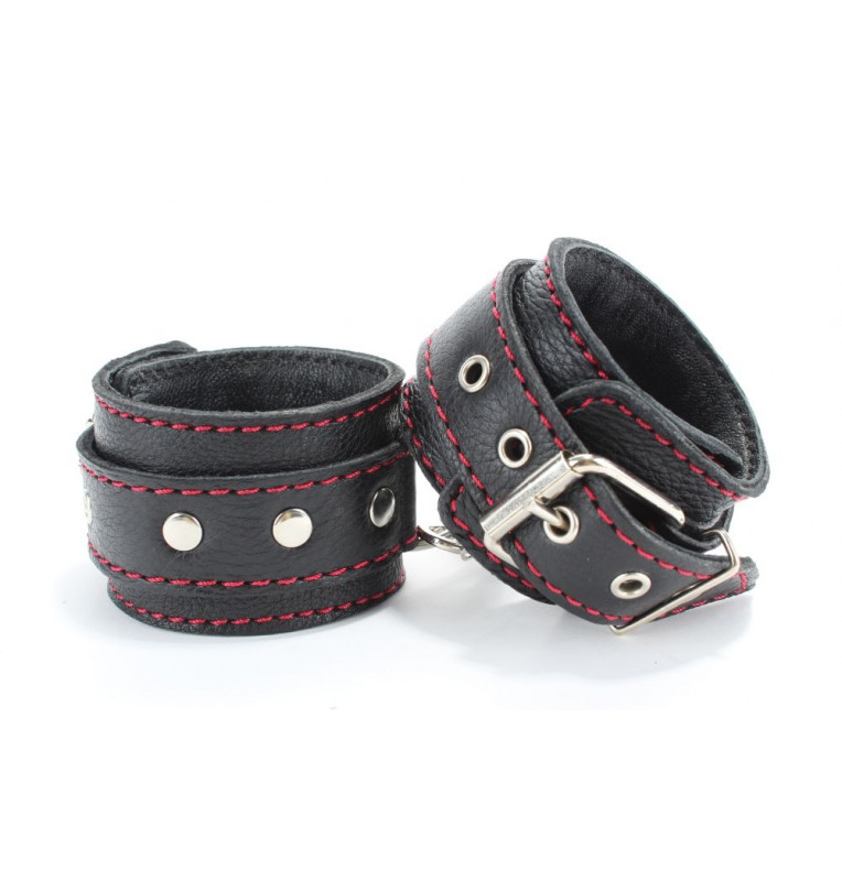 Оживить эротические игры Вам помогут поножи. Этот интимный аксессуар пользуется успехом. Выполненные в черном цвете с красной строчкой и декорированы заклепками. Модный интимный аксессуар не сдавливает и не нарушает кровообращение, так как изготовлен из мягкой кожи. Чтобы любимая никуда не убежала, поножи соединены короткой перемычкой. Длина перемычки - 6 см. Ширина оков - 6 см.