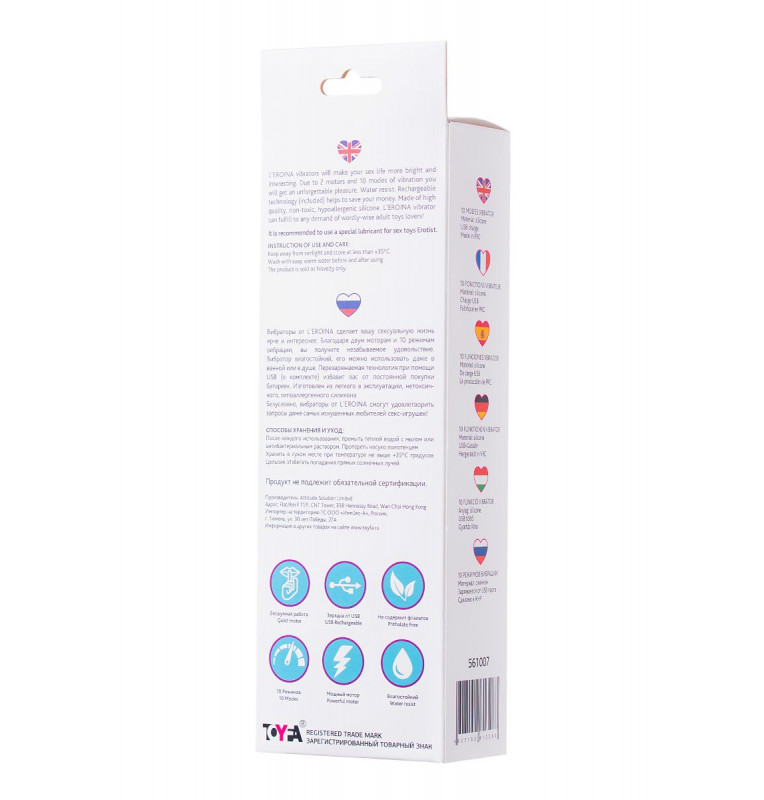 Вибраторы от LEROINA сделает вашу сексуальную жизнь ярче и интереснее. Благодаря 10 режимам вибрации, вы получите незабываемое удовольствие. Вибратор абсолютно влагостойкий, его можно использовать даже в душе. Перезаряжаемая технология при помощи USB избавит вас от постоянной покупки батареек. Изготовлен из легкого в эксплуатации, нетоксичного, гипоаллергенного силикона. Безусловно, вибратор от LEROINA сможет удовлетворить запросы даже самых искушенных любителей секс-игрушек! Не требует батареек и заряжается с помощью USB-провода (в комплекте). Рабочая длина - 12 см.
