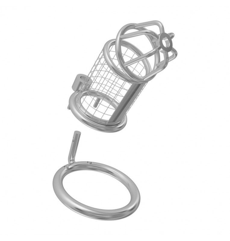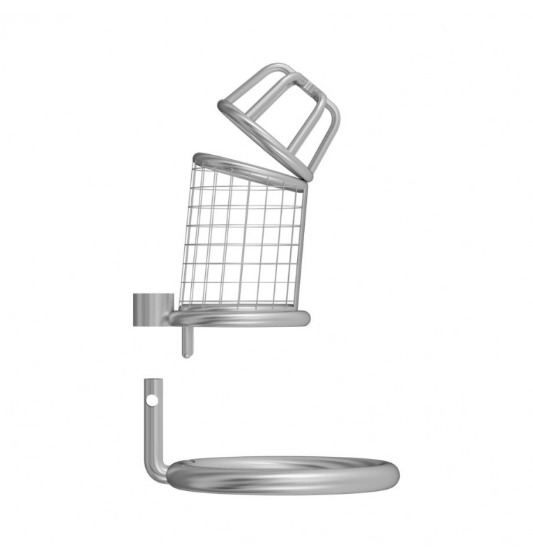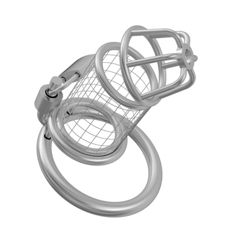 Надежно выполненный мужской пояс верности, препятствующий эрекции. Предназначен для сессионного ношения. Позволяет совершать гигиенические процедуры. Массивный и эффектный пояс полностью закрывает половой член. Фиксируется в области основания яичек при помощи неразъемного кольца, а сама сбруя в виде клетки надевается на половой член. Вся конструкция застегивается на небольшой замок с ключами в комплекте. Рабочая длина - 8,5 см. Внутренний диаметр корпуса - 3,5 см. Диаметр фиксирующего кольца - 5 см.