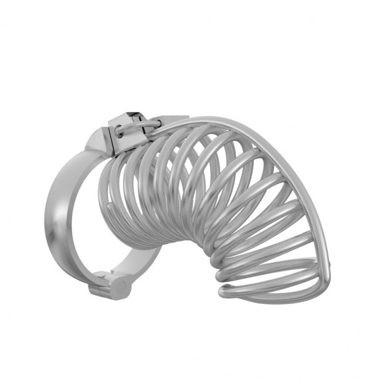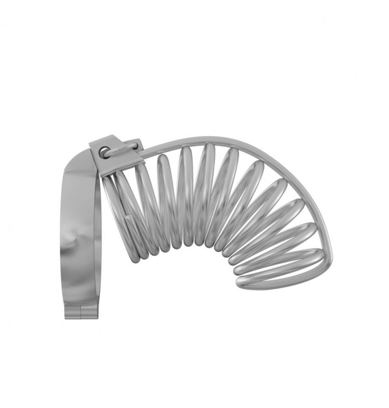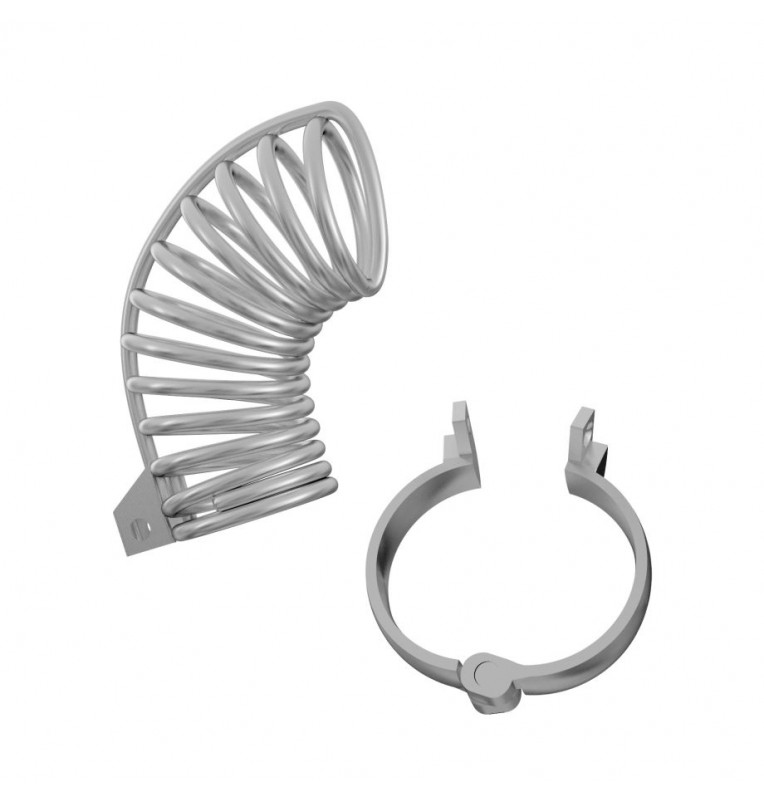 Надежно выполненный мужской пояс верности, препятствующий эрекции. Предназначен для сессионного ношения. Позволяет совершать гигиенические процедуры. Массивный и эффектный, используется в ролевых играх, эротических забавах и БДСМ-практиках. Сбруя в виде колец фиксируется в области основания яичек при помощи съемного раздвижного обруча. Небольшой замок и ключ в комплекте. Рабочая длина - 8 см. Внутренний диаметр корпуса - 5 см.