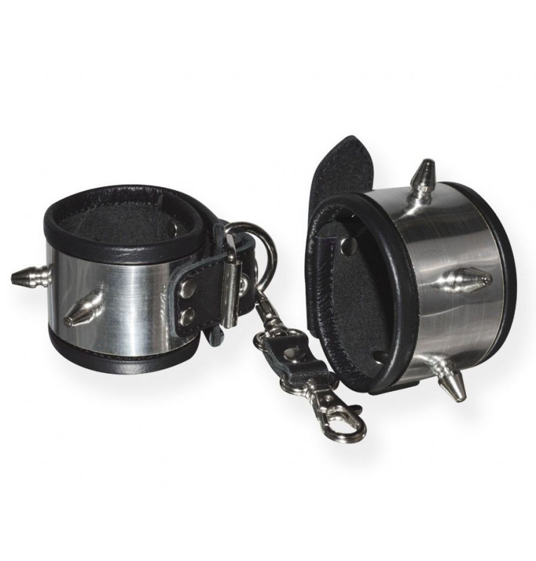 Серебристо-черные наручники с шипами и металлическим блеском.