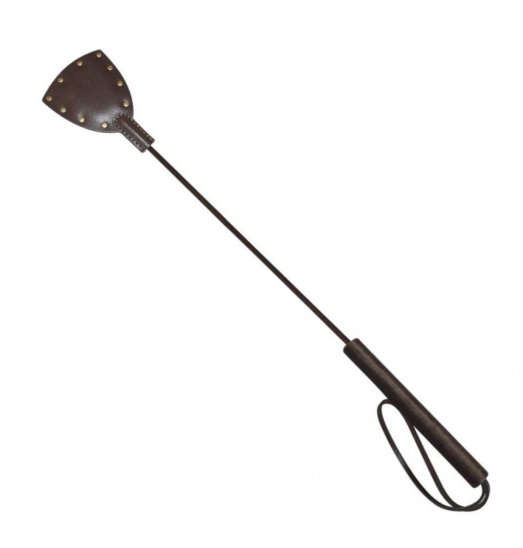 Стек Готика представлен в виде роскошного, изящного изделия цвета темного шоколада. Основательная хлопушка стека изготовлена из натуральной кожи высокого качества и украшена большим количеством клёпок. Хлопушку и рукоять соединяет упругий, но прочный хлыст. Комфортное использование девайса обеспечивает бархатистая рукоять, покрытая велюровой тканью. Ремешок-петля, находящийся на рукояти, позволяет дополнительно фиксировать стек на запястье. Длина рукояти - 17 см. Длина хлопушки - 15 см.