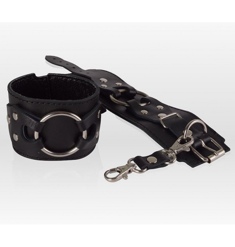 Черные наручники из натуральной кожи помогут ограничить движения секс-партнёра, достаточно лишь одеть на запястья комфортный, но прочный девайс. Лаконичные, но при этом красивые наручники подойдут, как для женщин, так и для мужчин, т.к. размер легко регулируется при помощи металлической пряжки. Готические фигурные накладки, удерживающие большое металлическое кольцо, придают наручникам агрессивной сексуальности и роскоши. Соединяются наручники при помощи небольших карабинов, скреплённых кожаной перемычкой. Для комфортного использования внутренняя часть наручников выполнена из бархатистой велюровой кожи. Вся металлическая фурнитура имеет никелевое покрытие. Ширина - 5,5 см.