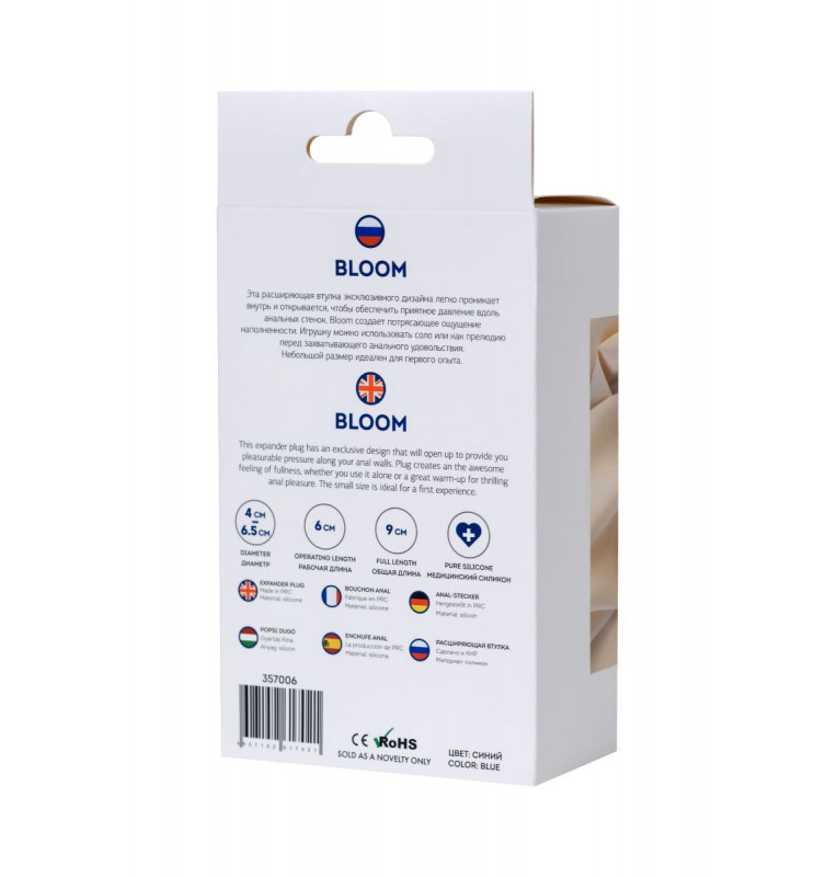 Эта расширяющая втулка эксклюзивного дизайна легко проникает внутрь и открывается, чтобы обеспечить приятное давление вдоль анальных стенок. Bloom создает потрясающее ощущение наполненности. Игрушку можно использовать соло или как прелюдию перед захватывающим анальным удовольствием. Средний размер подойдет как новичкам, так и опытным любителям. Рабочая длина - 6 см. Минимальный диаметр - 4 см.