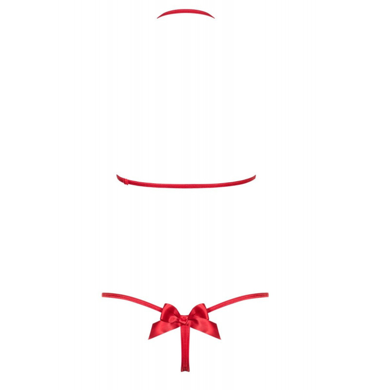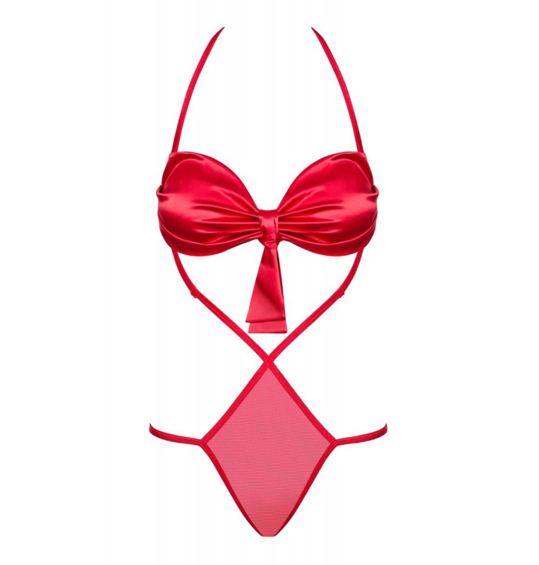 Пикантное боди Giftella выполнено из эластичной сеточки, атласной ткани и мягких стреп-лент. Лиф мягкий без косточек, бретель фиксируется за шеей. Низ боди выполнен в виде стринг с декоративным бантиком сзади.
