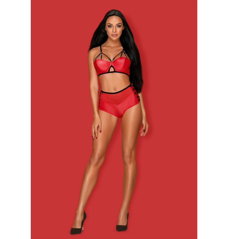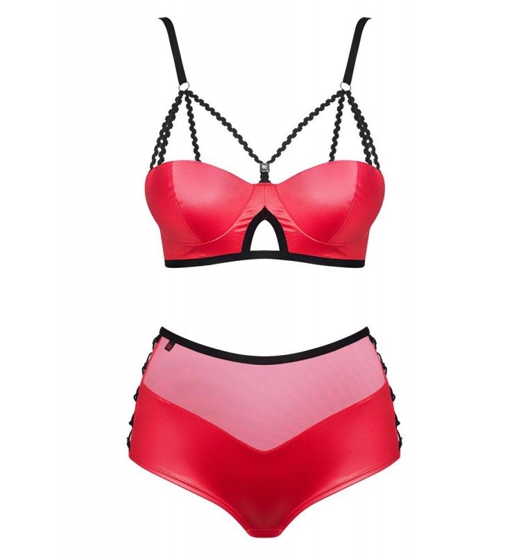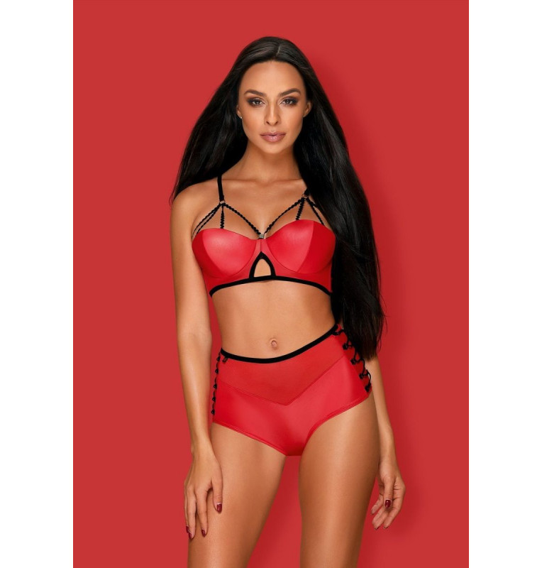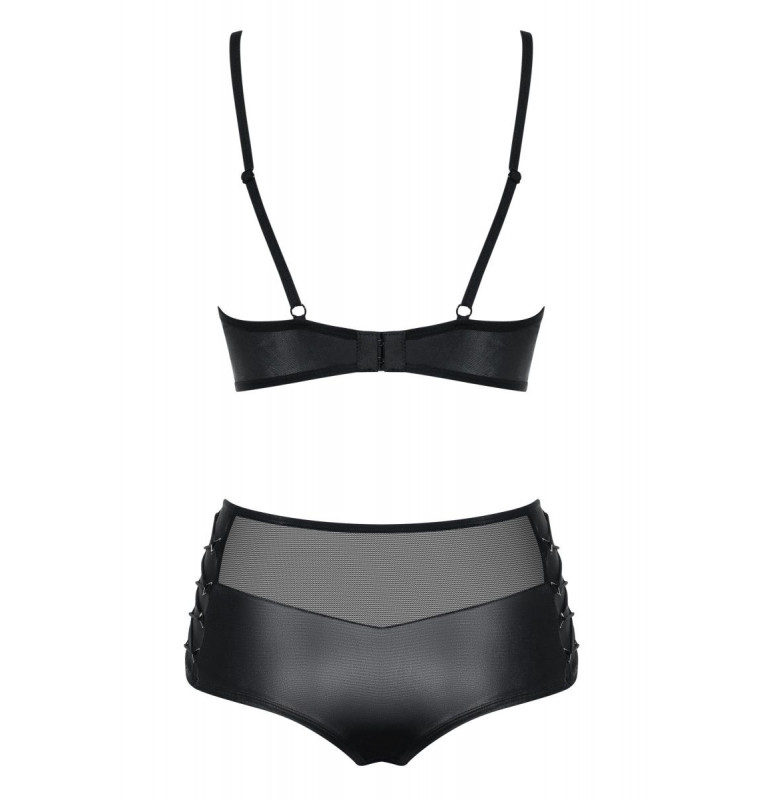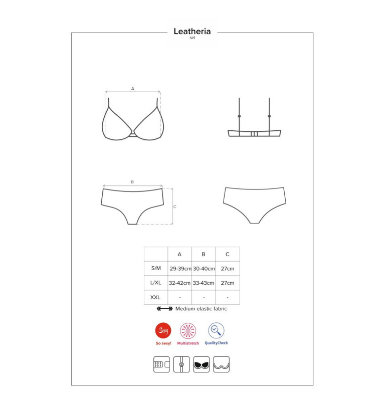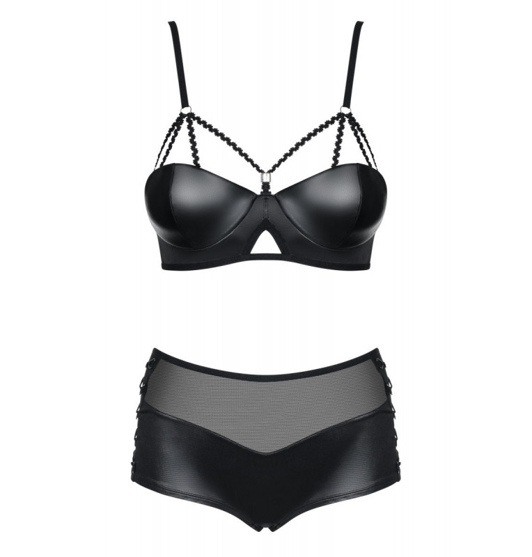 Эффектный комплект белья Leatheria состоит из бюстгальтера и трусиков, выполнен из эластичной эко-кожи. Лиф мягкий на косточках, бретельки и застежка на спинке регулируются. Трусики с высокой посадкой, выполнены из эластичной эко-кожи и мягкой сеточки, по бокам украшены соблазнительной шнуровкой В комплекте: бюстгальтер, трусики-шорты.